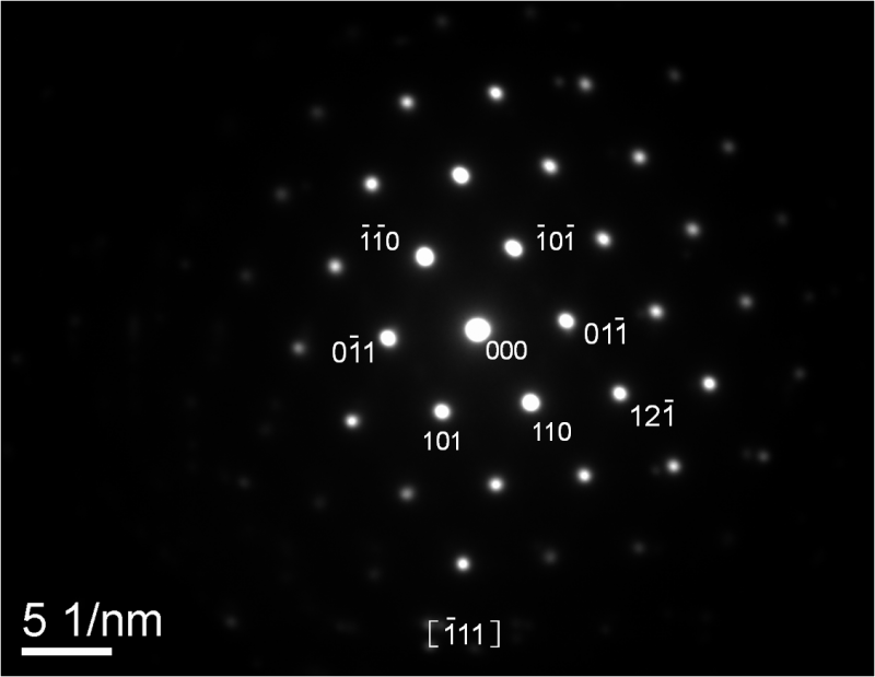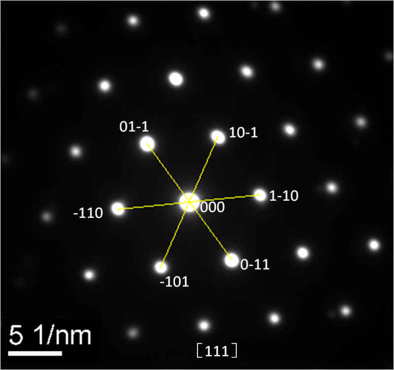 铜铁合金的衍射花样 经测量可得R1=R2=R3=9.83/2 φ=60°可以确定为<111>晶带轴 1/ R1=0.2034,与Fe的BCC {011}晶面族相吻合,可以确定是体心立方的Fe。 Fe衍射花样标定.png Fe衍射花样标定-1.png |