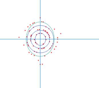 p=nlinfit(x,zeros(size(x,1),1),F,p0); 程序里这一行是,还有你这也太不动脑了吧。。。。。。 F=@(p,x)p(1)*x(:,1).^2+p(2)*x(:,2).^2+p(3)%匿名函数写成这个 则椭圆方程就是 (x^2)*p(1)+(y^2)*p(2) = - p(3) 长短轴自己对应分析吧。。。。。。。 |