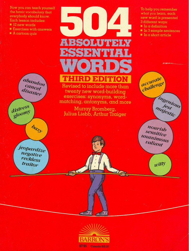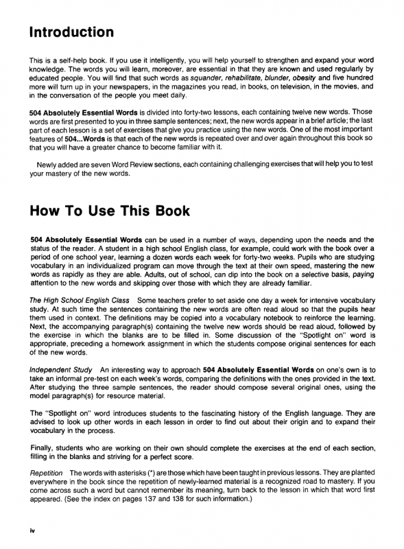 1.Sample Text The editors of the American Heritage dictionaries are pleased to present the second book in our “100 Words” series, 100 Words Every High School Freshman Should Know. The words we’ve chosen are ones that students entering high school should have mastered or are likely to encounter in their studies during their freshman year based on our analysis of textbooks and vocabulary books used in grades seven and eight. The items constitute a well-balanced mix of terms from A to Z, combining straightforward vocabulary items, such as eclectic, formidable, and impertinent, with words taken directly from areas of study, such as polygon and ellipse from mathematics and antibody and marsupial from biology. Entries, based on the content of the American Heritage dictionaries, are presented in an expanded layout that is easy to read and comprehend. In addition to the definitions, we have included additional example sentences to provide greater context. Similarly, we show quotations from a mix of widely assigned works by contemporary authors like Gary Paulsen (Hatchet), Maya Angelou (I Know Why the Caged Bird Sings), and John Knowles (A Separate Peace) as well as classic novelists such as Charlotte Brontë (Jane Eyre), Charles Dickens (Oliver Twist), and Lewis Carroll (Alice in Wonderland). Engaging notes provide background infor- mation for some of the scientific vocabulary and delve into the fascinating histories of many other words. To encourage study skills, we have provided exercises at the end of this book for improving vocabulary and encouraging active use of the dictionary. The first book in the “100 Words” series, 100 Words Every High School Graduate Should Know, has generated an enormous amount of interest—visitors to our website, www.ahdictionary.com, have viewed the selected words hundreds of thousands of times. We have been delighted by the enthusiastic response and are encouraged by the fact that parents, teachers, and students are taking a strong interest in using dictionaries as an integral part of literacy and vocabulary building. We hope that you will enjoy learning (or learning more about) the words in 100 Words Every High School Freshman Should Know and that you will find expanding your vocabulary to be a rewarding experience. 2. 400 Must-Have Words for the TOEFL® 3. 504 absolutely essential words 1.png 2.png 3.png 4.png |