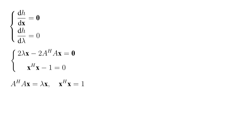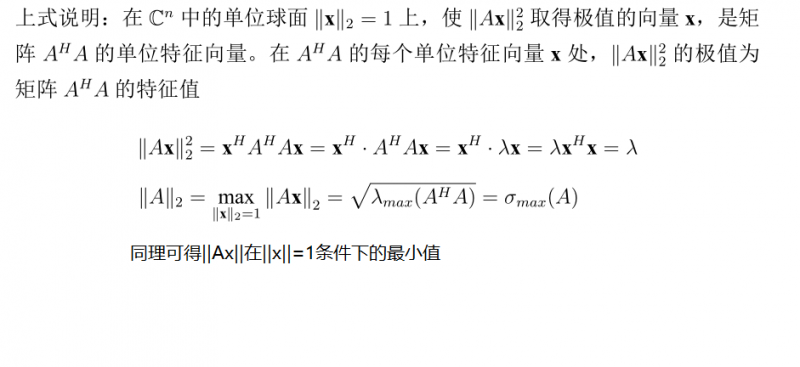 已知A是一个m*n的矩阵,是一个常矩阵,x是一个n*1的向量,是一个可变向量,求当向量x变化时||Ax||2/||x||2的最大值和最小值。其中||Ax||2和||x||2表示求2范数。 可以等价变换一下,求(||Ax||2/||x||2)^2的最大值和最小值,进一步可以等价为求以下式子的最大值和最小值。 即求x'A'Ax/(x'x)的最大值和最小值,A'和x'是求转置。 要求上面式子的最大值和最小值,我的思路就是对求x求导,但这涉及到了矩阵求导,就没有思路了…… 求助。 谢谢各位! |