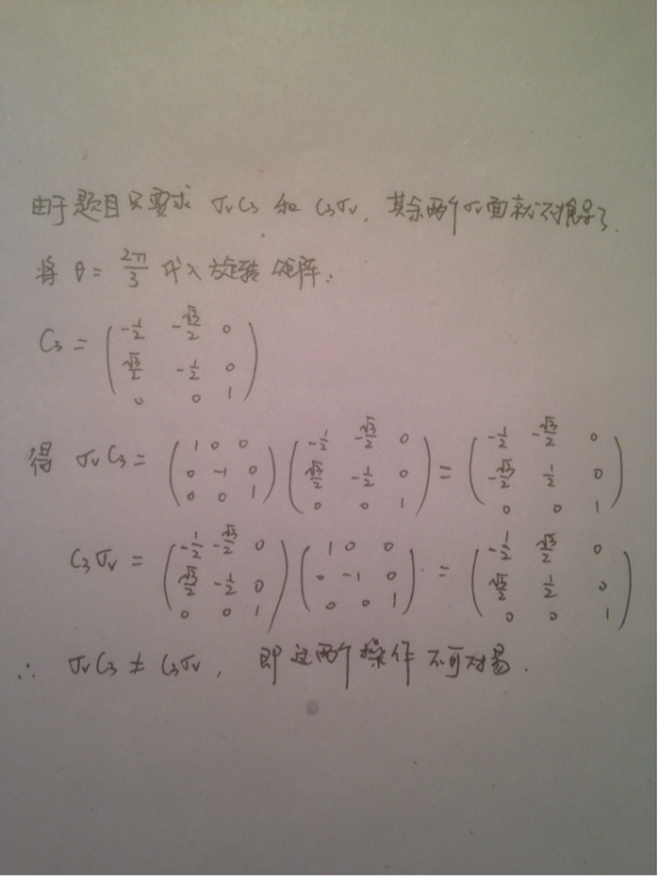 不是写了么……这两个操作不可对易,再进一步说就是C3V点群不是一个阿贝尔群。推荐楼主可以去看一下科顿的群论应用 发自小木虫IOS客户端 |