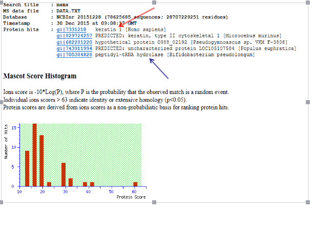 中间那个假定蛋白是不是受到了角蛋白的影响而出来了的?做出的图谱评分都很低,不知道该怎么办。如果要选择蓝色箭头的那个蛋白,是不是要去比对同源序列?