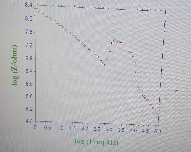 测试电极的电化学阻抗波谱EIS,中间有一个频率段(大概1KHz--10KHz)出现严重干扰,有大神知道么,求助! 测试条件如下:频率范围:1-10的五次方,扰动电压50mV,在0.1M PBS溶液中; 测试结果如下图所示: |