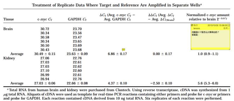在做定量PCR时,最后计算出表达倍数后,每个样品都应该有个标准偏差(SD),请问SD具体是该怎么计算? 我自己找了篇文献,但没看懂其中的SD是怎么计算出来的,附件中的图片是文献的数据,请问其中的0.17以及0.10是怎么计算出来的? 谢谢各位! 定量PCR计算.jpg |
