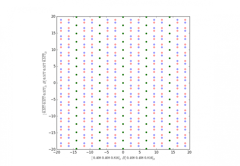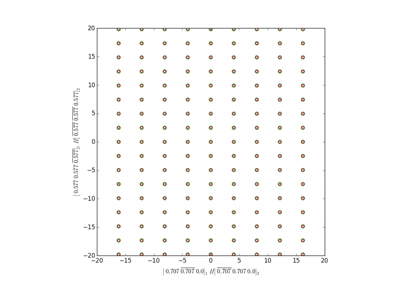 | sigma 9对称倾侧界面2-21见面上重位点(共格点绿色,晶粒1蓝色,晶粒2红色)见附件,该面是CSL界面,但是不是所有原子共格。 |