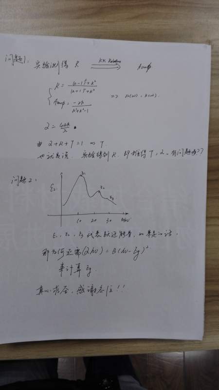 问题1: 但是现在高压下只能得到宽带的反射率,透射率很难测到。我了解到入反射的相位差可以通过kk关系测到,而R(n,k)和相位角thta(n,k)是n,k的函数。也是就是说可以通过反射率与相位角把光学常数求出,然后求出吸收率。问题是吸收率,反射率与透射率之间可以认为是相对独立的,为何这种方法可以直接通过反射把其他两者求出?
