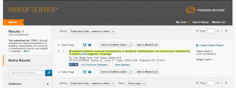 | 十月份接收一篇文章(Broadband plasmon-induced transparency in terahertz metamaterials via constructive interference of electric and magnetic couplings,Opt Express. 2015 Oct 19;23(21):27361-8. doi: 10.1364/OE.23.027361)。哪位虫子帮忙查一下是否已经被SCI数据库收录,谢谢!!! |