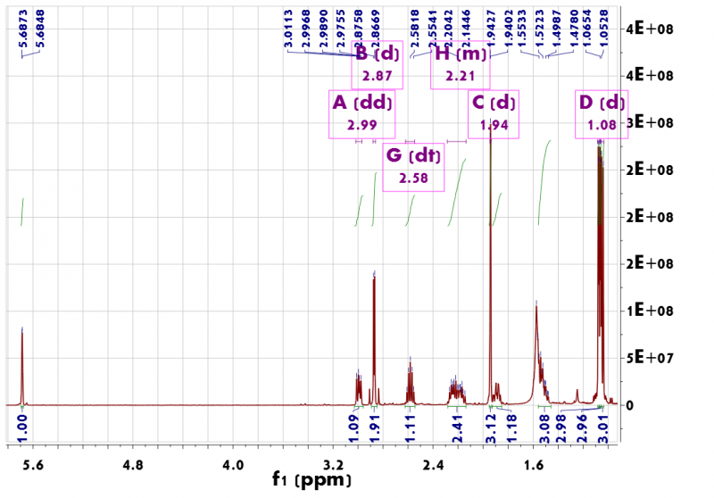 碳谱数据: CH 113.42 44.70 42.71 42.41 CH3 22.81 18.01 17.85 11.85 CH2 43.18 30.98 29.86 C 212.25 164.13 161.40 90.68 氢谱: 四个甲基全是d峰,化学位移1.94,1.08,1.06,1.05。 后三个甲基,虽每个都为d峰,但是每组d峰高度不一致,都是一高一低,但相差不大。 图片1.png |