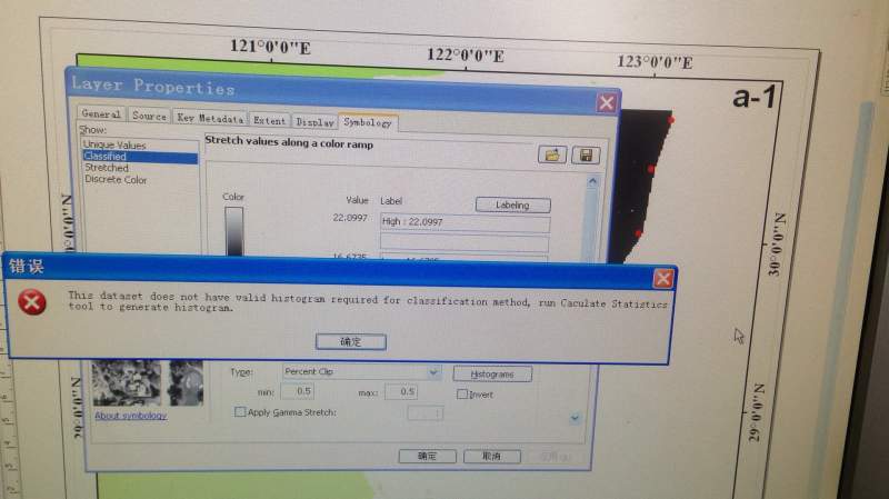 各位老师好,我在用地统计分析中的简单克里金插值时,作了裁剪,最后出现我想要的区块平面分布图后,选择“classified”,结果出现下图中的错误,想请教各位这个问题该怎么结局??谢谢! IMG_1033.JPG |