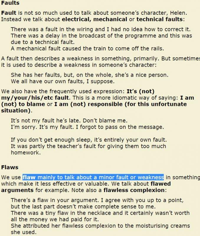 找一本大一点的纯英文字典你问的都有,自己慢慢琢磨就都有了。 例如 defect: 1. a lack of something necessary for completeness or perfection; shortcoming; deficiency 2. an imperfection, failing, or blemish 3. (Chemistry) crystallog a local deviation from regularity in the crystal lattice of a solid. See also point defect, dislocation. 2. defect - a failing or deficiency; "that interpretation is an unfortunate defect of our lack of information" shortcoming disadvantage - the quality of having an inferior or less favorable position 3. defect - an imperfection in an object or machinedefect - an imperfection in an object or machine; "a flaw caused the crystal to shatter"; "if there are any defects you should send it back to the manufacturer" flaw, fault imperfection, imperfectness - the state or an instance of being imperfect 4. (intr) to desert one's country, cause, allegiance, etc, esp in order to join the opposing forces [C15: from Latin dēfectus, from dēficere to forsake, fail; see deficient] Defect, flaw refer to faults, both literal and figurative, that detract from perfection. Defect is the general word for any kind of shortcoming, imperfection, or deficiency, whether hidden or visible: a birth defect; a defect in a plan. A flaw is usually a structural defect or weakness that mars the quality or effectiveness: a flaw in a diamond. 例句 The report pointed out the defects in the present system. He defected from the party twenty years ago. |
