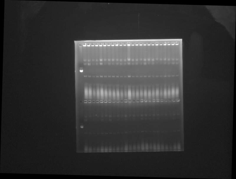 请问哪位大神懂得菌液电泳的核算图啊?就是挑了斑,加培养基培养约5个小时,然后取10ul加裂解液裂解,直接跑胶检测,第一个孔点的对照质粒(骨架) PBACM-NPU-B2 第一块前四排菌液电泳 2016-01-06 19 时 16 分.jpg |