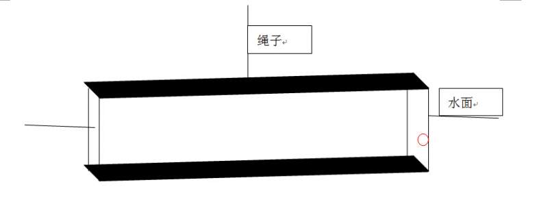 一箱子破损,红色圆圈表示一个破口,其他位置完好。箱子用一绳子吊着,箱体部分浸没在水中,箱体内外 的水面平齐,水面没过破,已知箱子重量为100 N,进入箱子中的水体积为100 m3,绳子的拉力为? ![]() 001.jpg |