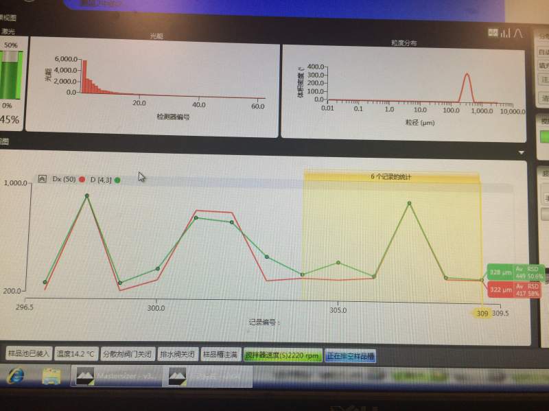 你们这个粒度有点大,需要充分分散,然后测试的时候记得在尽量相同的透过率下测试,才能保证重复率。 发自小木虫Android客户端 |