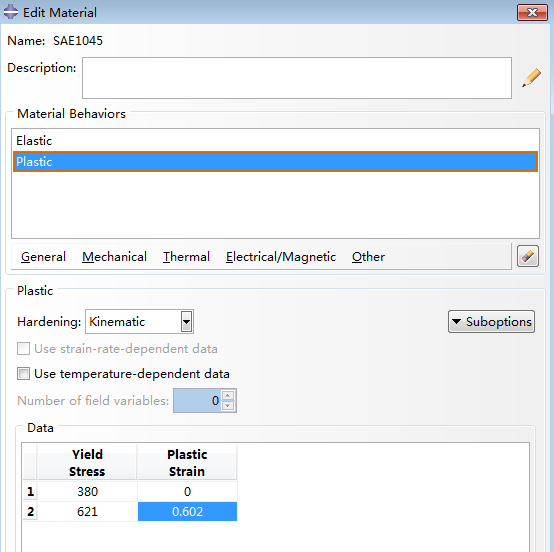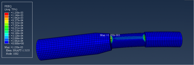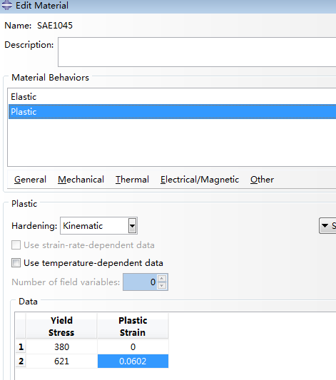 自己对一个轴类试件进行弹塑性分析 结果出来后发现塑性应变明显偏少一个数量级 后面更改抗拉强度621Mp对应的塑性应变参数由0.0602到0.602后,结果也差别不大 想请教大家是不是哪里设置的不对,不胜感激 0.0602.png S-0.0602.png PEEQ-0.0602.png 0.602.png S-0.602.png PEEQ-0.602.png |