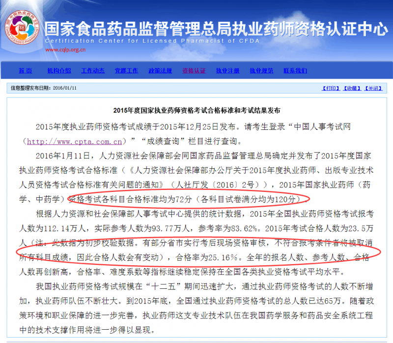 2015年度国家执业药师资格考试合格标准和考试结果发布 2016/01/11 2015年度执业药师资格考试成绩于2015年12月25日发布。请考生登录“中国人事考试网(http://www.cpta.com.cn)”“成绩查询”栏目进行查询。 2016年1月11日,人力资源和社会保障部会同国家食品药品监督管理总局确定并发布了2015年度国家执业药师资格考试合格标准(《人力资源社会保障部办公厅关于2015年度执业药师、出版专业技术人员资格考试合格标准有关问题的通知》(人社厅发〔2016〕2号)),2015年国家执业药师(药学、中药学)资格考试各科目合格标准均为72分(各科目试卷满分均为120分)。 根据人力资源和社会保障部人事考试中心提供的统计数据,2015年全国执业药师资格考试报考人数为112.14万人,实际参考人数为93.77万人,参考率为83.62%。2015年考试合格人数为23.5万人(注:此数据为初步校验数据。有部分省市实行考后现场资格审核,不符合报考条件者将被取消所有科目成绩,因此合格人数会有变动),合格率为25.16%。全年的报名人数、参考人数、合格人数再创新高,合格率、难度系数等指标继续稳定保持在全国各类执业资格考试平均水平。 我国执业药师资格考试规模在“十二五”期间迅速扩大,通过执业药师资格考试的人数不断增加,执业药师队伍不断壮大。到2015年底,全国通过执业药师资格考试的总人数已达65万。随着政策环境和职业保障的进一步完善,执业药师这支专业技术队伍在我国药学服务和药品安全系统工程中的技术支撑作用将进一步得以显现。 http://cqlp.org/info/link.aspx?id=2729&page=1 11.png |