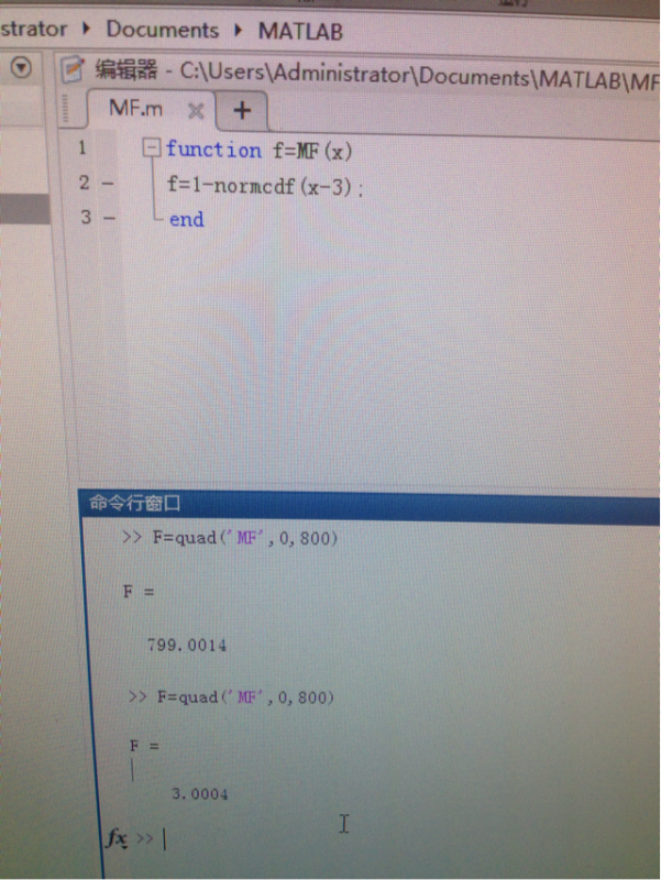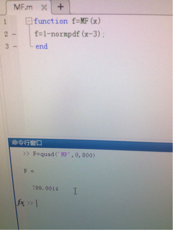 先建立一个函数MF,把要积分的函数输进去,保存;然后在命令窗口输入下面的指令就好了