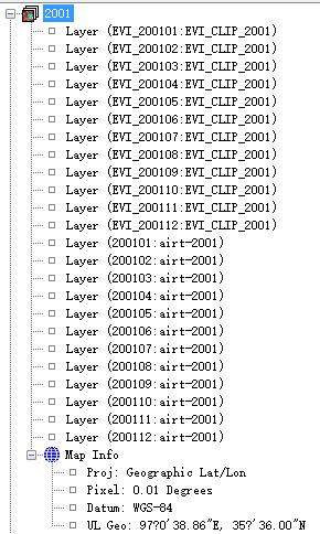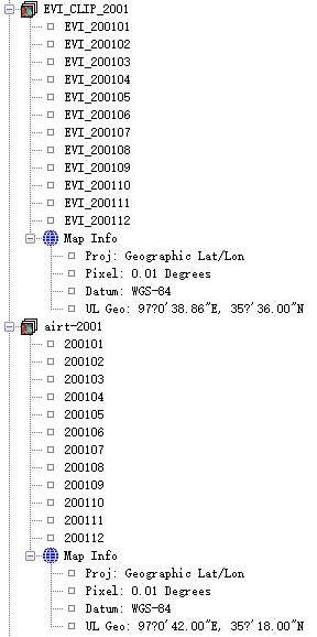 数据:有两个多波段,EVI和温度数据,都是由某一年对应的12个月份的数据在ENVI中组合的多波段,如果需要我可以将其组合为一个含24波段的数据,即所有像元值能对应起来。一个多波段文件为200M的样子。具体数据如下图。 要求:求任意像元上,一年中EVI最大对应月份的温度。 哪位大神帮帮忙!在此拜谢了。本人IDL没入门,只能大致看一下具体意思。 EVI和温度数据.jpg EVI和温度组合数据.jpg |