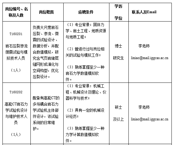 2016年度大型仪器装备技术研发人员招聘启事 中国科学院地质与地球物理研究所是我国综合性的固体地球科学研究基地,根据研究所战略布局和研究室学科发展的需要,2016年度拟在所内、外公开招聘工程地质与水资源研究室和地磁与空间物理研究室大型仪器装备技术研发技术人员。 网址:https://www.igg.cas.cn/rcjy/rczp/201601/t20160114_4518415.html 一、招聘岗位与应聘条件: (一)基本应聘条件 1、具有一定的研发能力、良好的职业道德和团队合作精神,身体健康; 2、一般具有硕士及以上学历; 3、年龄在35岁以下,条件突出者可适当放宽; 4、有研发工作经历或成果者优先录用。 二、招聘岗位设置与条件 详见图片。 欢迎喜欢科研的同志踊跃投稿 1.png |