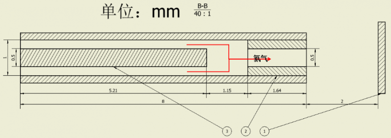 已知某结构尺寸如图: 1——玻璃片 2——阴极 3——阳极 求:在脉冲电压500V、频率13.56MHz、电流1-2mA、氦气流速0.2L/min下,能否放电?如能放电其尾焰长度多少? 图片1.png |
