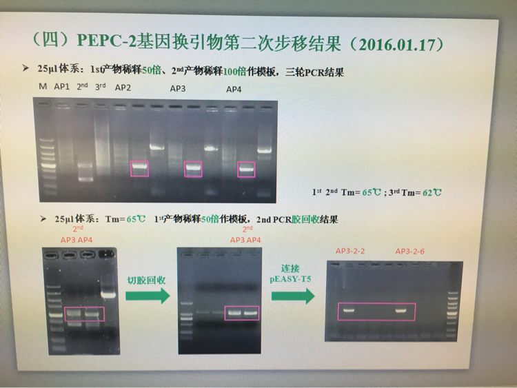 | 目前在利用takara的genome walking试剂盒克隆玉米中一段启动子序列,第一次利用AP1-4的时候均得到了1.3kb的产物,设计特异引物克隆这一段,已经测序得到这一段序列。在此基础上进行第二次walking,第三轮的GSP设计在距离第一次1.3kb 5‘端140bp的位置,这次AP1,3,4得到的产物相似,AP2得到产物略小约900bp,然后设计一对引物可以检测出上面提到的140bp进行初筛,结果只有AP2中所有克隆都含有这一段,克隆、测序、BLAST比对,900bp可以比对到染色体上相应位置,并且与第一次的1.3kb可以重合。拼接后得到约2.0kb的区段,只需要对1.7kb的区段进行研究,设计引物扩增,在玉米B73中克隆到目的条带,但是未知材料里没有任何产物。请教一下各位,这是什么情况?明明两轮WALKING得到的产物可以拼接上而且在未知材料中得到的1.7kb也可以比对到染色体上相应位置,但是扩增不出来,其中的1.3kb已经得到证实,PCR体系及条件没有问题,求解。 |