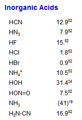 http://www.chem.wisc.edu/areas/r ... x.htm#opennewwindow 这个网站查有机化合物pak(如附件中图所示),那个上标是什么意思? 举个例子:HF网站上pak=15.‘52 百度文库中查到的氢氟酸 HF ka=3.5×10-4 pka=3.5 这两个结果不一样,大家知道原因吗? kainorgacid.gif |