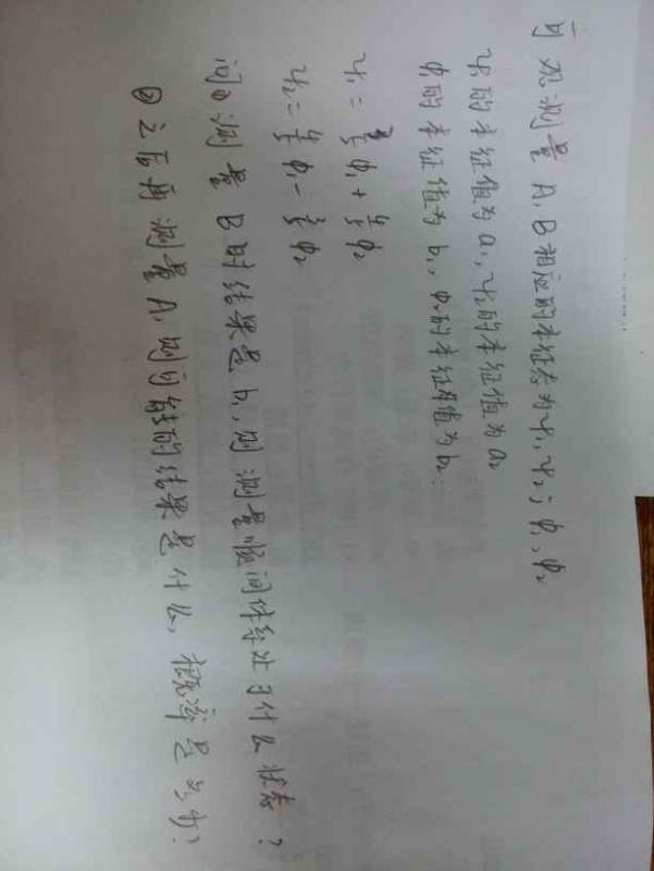第一问:根据量子力学塌缩原理,测得B的本征值为b1时,体系波函数塌缩到其对应的本征函数phi1 第二问:phi1可写为phi1=3/5*psi1 + 4/5*psi2 所以测得a1的几率为9/25,测得a2的几率为16/25 发自小木虫IOS客户端 |
