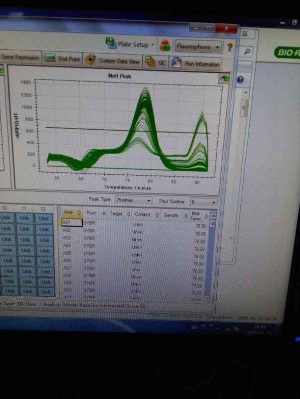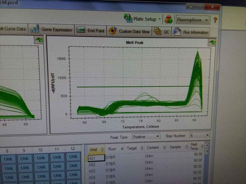 一般来说,起峰在80之前基本是二聚体,你这个前面的起峰比目的带还高,你把定量完的跑个胶,估计是有杂带或者二聚体的。换引物吧。你的引物没有半定量筛选吧(普通pcr跑胶看条带是否单一,然后再上机筛选,筛选好了再正式上样)? 发自小木虫Android客户端 |
