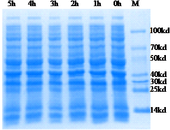 最近原核表达SDS-PAGE一直没结果。也不知道出现了什么问题。原核表达载体是pet28a,菌BL21,培养基LB,经菌液pcr,酶切和测序,表明重组质粒构建成功,诱导浓度1mmol/L,取样0-5h,但是每次跑出来的条带都一样,没有所需目的条带的表达,目的基因在27或33kd,跑出来的图片每次都没表达,并且条带深浅度一样。求助给点意见。 `~~~4[GB2GK@Q)LEVF_[JU0.png |