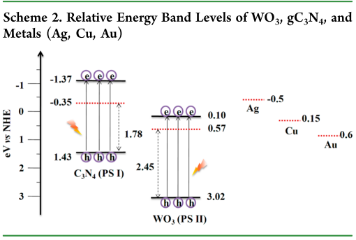 如图所示,C3N4和WO3分别是Z型催化体系的PS1和PS2,中间电子的传递介质为Ag,Au,Cu,文献上说根据半导体和金属的费米能级能级的高低,电子会转移金属介质Cu和Ag上,而不能转移到金上,请大神指教,电子是转移到费米能级更正的Au还是转移到更负的Ag上? Z体系.png |