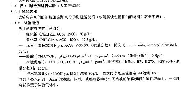 将1000ml纯净水倒入干净的烧杯内; 称取9.9g氯化钠慢慢放入烧杯内,搅拌均匀;称取0.2g蔗糖慢慢加入烧杯内,搅拌均匀;称取0.2g蔗糖慢慢加入烧杯内,搅拌均匀;称取01.7g尿素慢慢加入烧杯内,搅拌均匀;称取0.8g硫化钠慢慢加入烧杯内,搅拌均匀;量取1.4ml乳酸慢慢加入烧杯内,搅拌均匀;向溶液中加入氨水,调节溶液PH值至4.5—4.7(约需0.3ml氨水) 上面是人工汗水的配方,参考的标准是什么 |