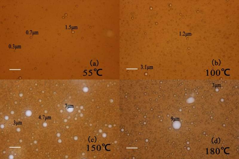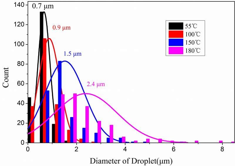 Fig. 4. The droplet size distribution of the heavy crude oil/brine emulsions under 55 oC,100 oC,150 oC (PVT) after 15 days separation. The solid line in the histogram graph represents a normal fitting curve. 是乳状液显微图片数据化,用软件统计液滴尺寸,用origin直接作出histogram图,直接点击图形拟合。