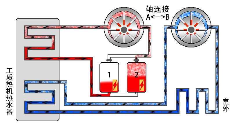 以空气能热水器作功形式为例解释;在闭合循环系统内使用两个以上的固定容器为存储制冷剂,以及在容器内电加热(如;加热棒)直接加热、汽化制冷剂的方式,促使液体制冷剂膨胀为气体体积,在容器的反作用力下、单向循环(循环方式为交替给固定容器内的制冷剂加热,电磁阀交替打开已经被加热释放为空置的容器的回流阀门,让系统内的液体制冷剂回流到容器内)。顺序为(电加热进行汽化。在热水器里面释放热能进行冷凝。电磁阀顺序开闭进行回流)电磁阀为自保持式电磁阀(微功耗) 这个循环系统的意义是,例如;加热棒加热制冷剂r401a温度为60度时候制冷剂压力达到4000KPA,把这个温度压力直接释放给热水器吸收,在容器释放的时候制冷剂的汽化压力4000KPA可直接反向推动转子压缩机旋转,(没有电动机的压缩机,只是转子部分)这个转子部分制作为两个,一个是主动旋转(被气压推动转子),一个是被动旋转(被带动旋转),这个被动旋转的转子可以带动另一套室外机进行循环(也就是空气能热水器的原型部分,只是没有了电动机的转子压缩机)也就是这个循环系统的动力来源于第一套的气压推动。 这样做的意义为;比如;一千瓦的加热棒,在加热制冷剂产生闭合循环的时候,所产生的热能全部热交换给热水器,没有丢失,但是间接的高温高压气体推动产生了机器能(等于压缩机)带动另一套空气能的制冷剂循环系统,所产生热、由此增加产热效率,间接的提升了电热能的转换率。 问题是这个理论是否是对的,错在哪里?反对方意见认为;1不管你有多少分系统,它做的功的总和不会超过它消耗的能量。2此举完全没意义,因为液体汽化都有吸收大量热量。所谓高效率只是你的错觉。3总得做功不会多出来的。有的地方做功必然有的地方会消耗能量 |