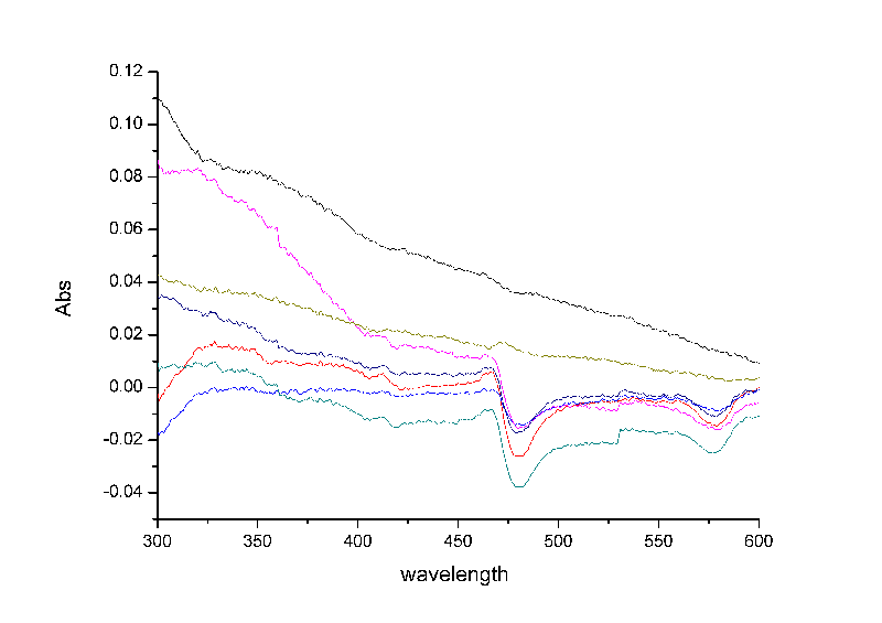 这是我做的一个聚芴高分子薄膜(将聚芴高分子填充进入纳米管之后所做的一个膜)在加电压的情况下的紫外谱图,本来想通过加电压(三个值 150V-50V-15V)改变聚芴高分子的流动速率,结果发现,紫外谱图上根本就检测不到聚芴高分子的峰值(365左右),反倒在480以及560那出现一个倒立的峰,是不是因为我家的电压太大了导致聚芴分子的分解或者其他之类的变化,求解,谢谢。 PPh.gif |