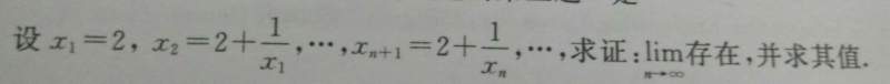 令f(x)=2+1/x, 显然f(x)单调减少。 X1=2=20/10 X2=2+1/2=5/2=25/10 X3=2+1/5/2=2+2/5=24/10 …… 递推下去有 X1<X3<X5<……<X2n-1<……<X2n<……<X4<X2 即奇数列增加,偶数列减少。奇数列的上限为X2=5/2,偶数列的下限X1=2,两者都收敛。 下边可以分别令奇偶列的极限为P、Q,limX2n-1=P,limX2n=Q。(n->∞) 令G(X)=f(f(Xn)),G(Xn)必定单调增加,则Xn+2=f(Xn+1)=f(f(Xn))=G(Xn),由G(Xn) 的连续性可以知道 limXn+2=limG(Xn)=G(limXn),在n分别为奇数或偶数时, P=G(P)=f(f(P))=(5P+2)/(2P+1),Q=G(Q)=f(f(Q))=(5Q+2)/(2Q+1), 据方程x=(5x+2)/(2x+1),即x^2-2x-1=0只有正解,x=1+√2=2.414。所以P=Q=2.414,也就是奇数列和偶数列的极限都是2.414,故此整个数列{Xn}收敛。收敛于2.414。 同样的我们可以得到这样两个关于极限的结论 1、当X3落在以X1、X2构成的区间之外时,数列{Xn}发散。 2、当X3落在以X1、X2构成的区间之内时,数列{X2n-1}和{X2n}均收敛,当两者收敛值相同时,数列{Xn}收敛 发自小木虫IOS客户端 |