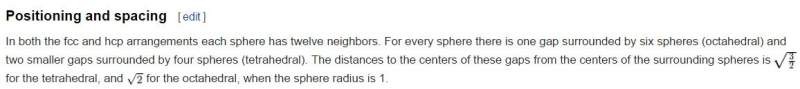 求助一个关于密堆积的问题,因为刚刚入门学晶体学的知识,好多东西都看得云里雾里的。 现在在阅读维基百科的词条,https://en.wikipedia.org/wiki/Close-packing_of_equal_spheres 其中在Positioning and spacing一栏下面,正文写道 In both the fcc and hcp arrangements each sphere has twelve neighbors. For every sphere there is one gap surrounded by six spheres (octahedral) and two smaller gaps surrounded by four spheres (tetrahedral). 主要没搞懂的是,为什么针对于每一个小球,有一个被六个小球包围的缝隙,以及另外两个较小的被四个小球包围的缝隙?这个怎么从图中可以看出来呢? 跪谢! |