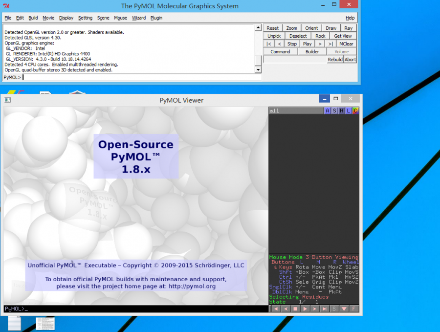 (1)Download and install Python 2.7.9 (and only python 2.7.9)。 (2)解压Pymol1.8.0.0_win_64.zip,执行install_pymol.bat,安装完后运行C:/Python27/pymol.exe即可。 更详细的安装方法见: http://tubiana.me/how-to-install ... -windows-linux-mac/ |