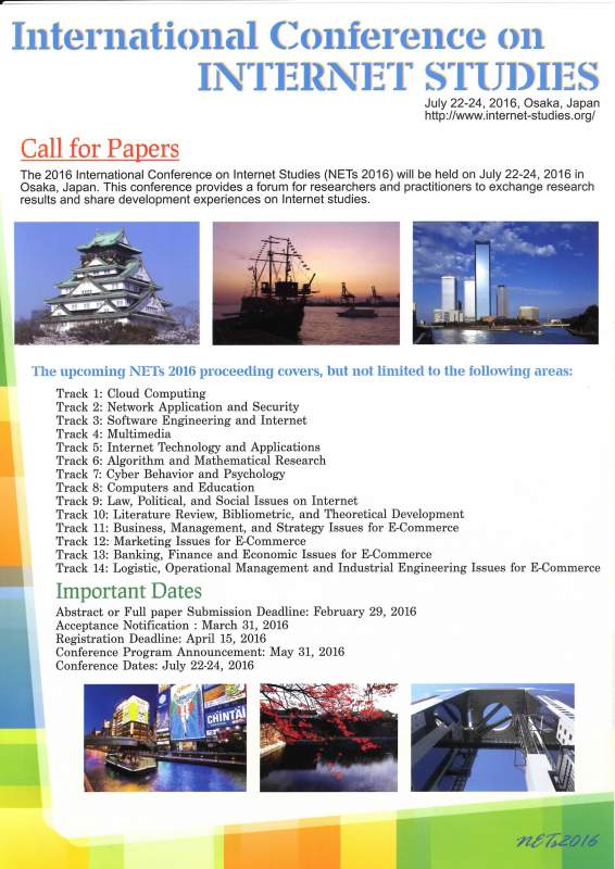 International Conference on INTERNET STUDIES July 22-24, 2016, Osaka, Japan https://nets2016.org/ https://www.internet-studies.org/ Organized by: Academy of Taiwan Information Systems Research (ATISR) Sponsored by: National Taipei University The 2016 International Conference on Internet Studies (NETs 2016) will be held on July 22-24, 2016 in Osaka, Japan. This conference provides a forum for researchers and practitioners to exchange research results and share development experiences on Internet studies. IMPORTANT DATES Abstract or Full paper Submission Deadline: February 29, 2016 Acceptance Notification : March 31, 2016 Registration Deadline: April 15, 2016 Conference Program Announcement: May 31, 2016 Conference Dates: July 22-24, 2016 Publication Opportunities All submitted papers will be reviewed using the blind method. Selected competitive papers at the conference will be further evaluated for possible submission to special issues of the following journals collaborating with our conference IJECS - International Journal of Electronic Commerce Studies (ISSN: 2073-9729) CMR - Contemporary Management Research (ISSN: 1813-5498) IJCSE - International Journal of Cyber Society and Education (ISSN: 1995-6649) The upcoming NETs 2016 proceedings covers, but not limited to the following areas: Track 1: Cloud Computing Track 2: Network Application and Security Track 3: Software Engineering and Internet Track 4: Multimedia Track 5: Internet Technology and Applications Track 6: Algorithm and Mathematical Research Track 7: Cyber Behavior and Psychology Track 8: Computers and Education Track 9: Law, Political, and Social Issues on Internet Track 10: Literature Review, Bibliometric, and Theoretical Development Track 11: Business, Management, and Strategy Issues for E-Commerce Track 12: Marketing Issues for E-Commerce Track 13: Banking, Finance and Economic Issues for E-Commerce Track 14: Logistic, Operational Management and Industrial Engineering Issues for E-Commerce For problems about conference, please contact the Conference Coordinator Dr. Chien-Chang Chen or Dr. Chih-Chien Wang nets2016@internet-studies.org FACEBOOK-NETsconference NETs2016CFP (1)_頁面_1.jpg |