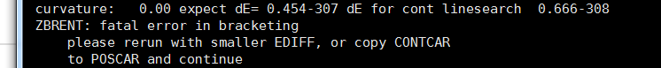 查看任务输出文件,发现有如图提示,我将INCAR文件中EDIFF调成1E-5还是这样,另外也CONTCAR改成POSCAR,也是这样,没有提示收敛语段,想请问大神该怎么解决,谢谢! KSMR6ZD9W)VOL_}(N52DFAA.png |