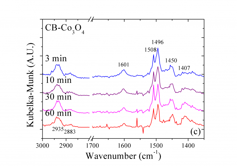 见附图。3000附近双峰是甲基,1600单峰是芳环,1450和1400应该是CH3。按理来说,1500附近的双峰应该还有一个也是芳环振动。但是问题是另一个峰是啥东西啊?以及哪一个峰是芳环的? 实验是在Co3O4表面通甲苯-氮气混合气。没有含氮含氯什么的杂元素有机物进入体系。 谢谢啊! 甲苯在Co3O4表面吸附 |